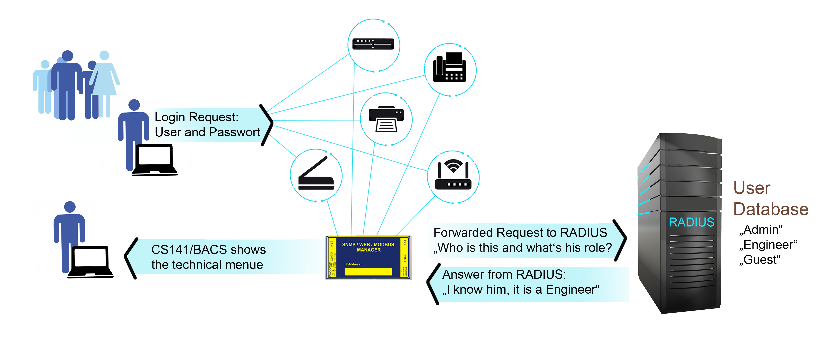 Ein CS141/BACS bietet über die dynamische Passwortverwaltung eine zentrale Nutzerverwaltung an und blendet genau die Menüs ein, die ein Administrator für den Nutzer vorgesehen hat.