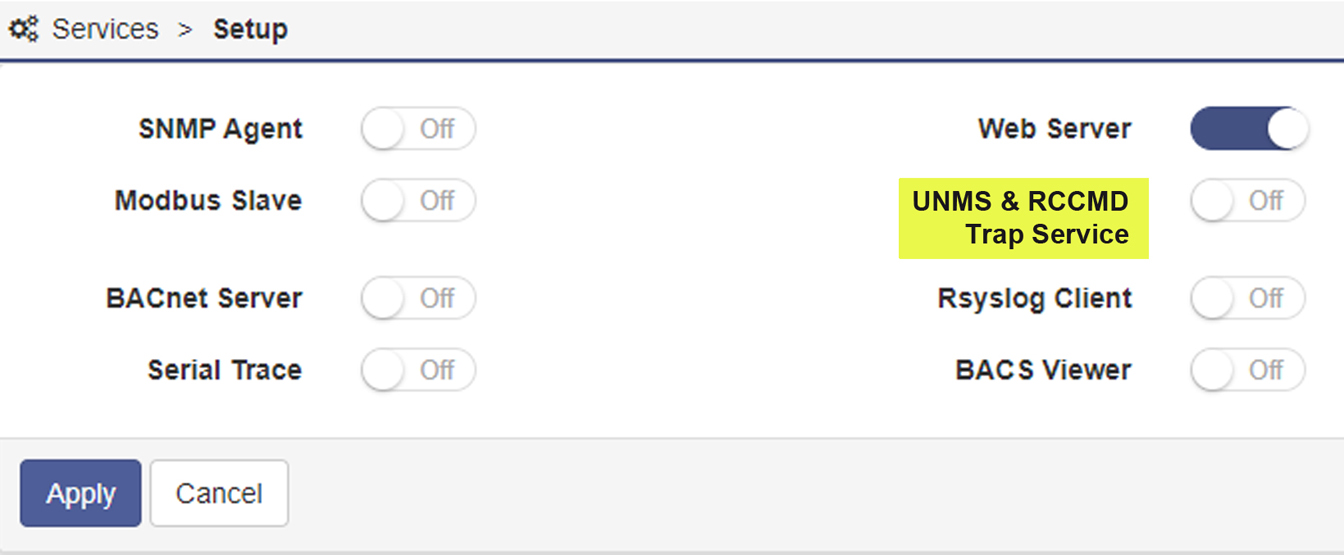 Beim CS141 und BACS sind z.B. die RCCMD-Dienste bei der Erstauslieferung abgeschaltet worden. Anwender die bisher einfach RCCMD Clients installiert haben und automatisch von den CS141/BACS eine Nachricht erhielten, wenn es zu Problemen in der Stromversorgung kam, müssen nun leider einige Mausklicks mehr tätigen um RCCMD wieder zu aktivieren: Im CS141 / BACS-Menü muss nun der “UNMS & RCCMD Trap Service“ angeschaltet werden um diese Funktionalität wieder herzustellen.
