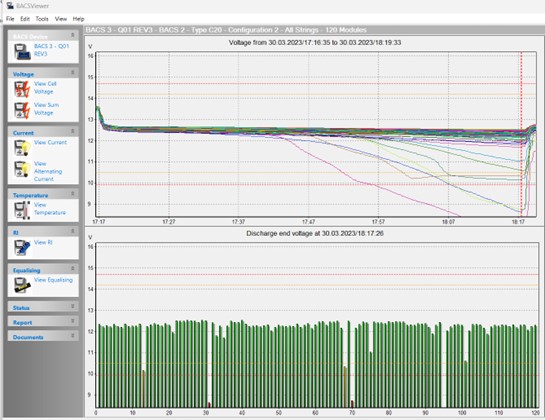 Da BACS auf jeder Batterie ohnehin installiert wird, könnte diese material- und personalintensive zusätzliche Messung eigentlich entfallen. Alles, was BACS benötigt sind Entladungen, die entweder „von selbst“ auftreten (wegen Stromausfall) oder „manuell“ durch den Batterietechniker ausgelöst werden. Analysetools wie der BACS VIEWER erlauben eine schnelle und direkte Auswertung der aufgezeichneten Daten der Entladung und liefern direkt den SOC und SOH als Ergebnis und den direkten Vergleich mit den Daten einer früheren Entladung und damit um wieviel % die Laufzeit der Akkus in angegebener Zeitspanne abgenommen hat.