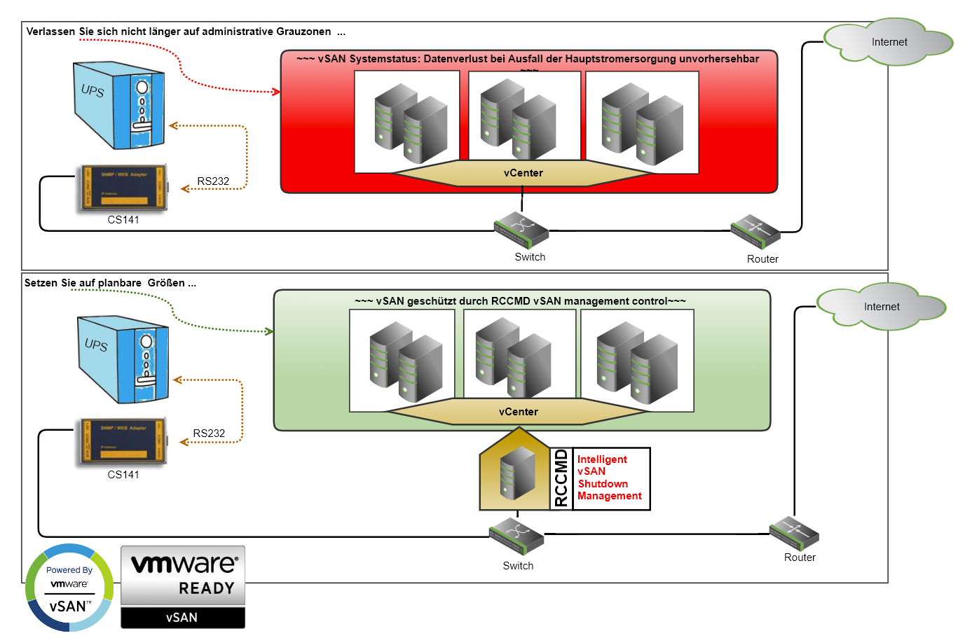 RCCMD (Remote Control Command) ist weltweit überall im Einsatz, wo eine flexible Softwarelösung für ein Notfallshutdown notwendig ist. RCCMD läuft plattformunabhängig und kann physikalischen Maschinen mit vollständig virtualisierten Umgebungen verbinden, um einen strukturierten Shutdown zu gewährleisten.