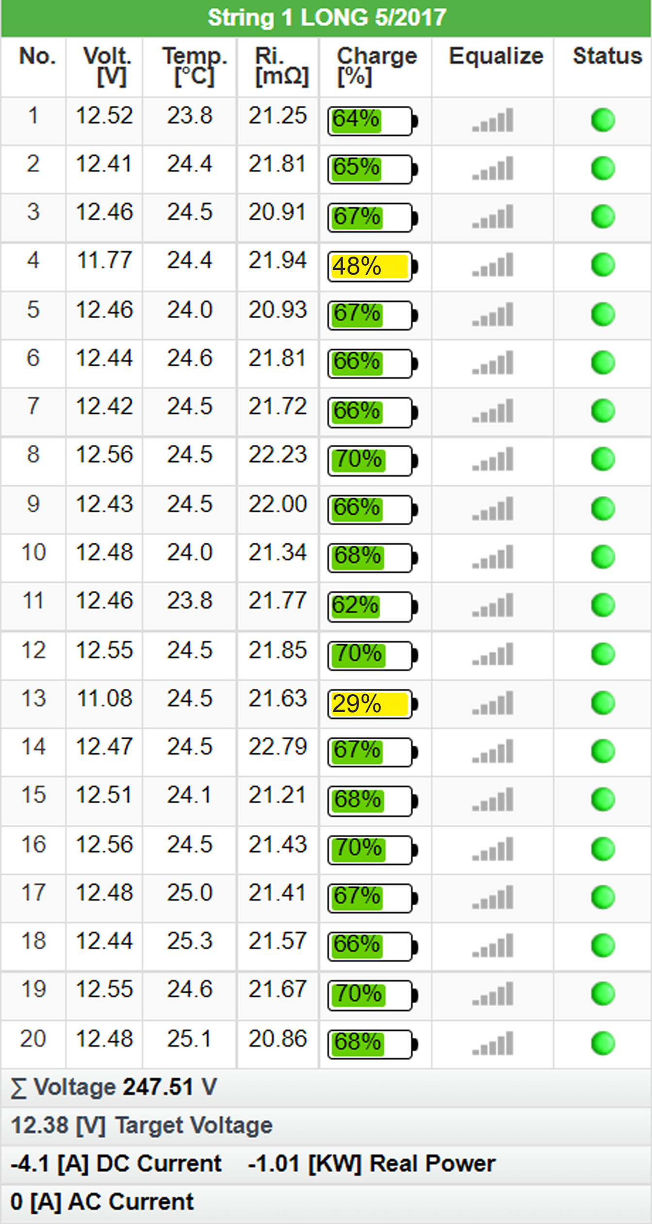 Most UPS users are not aware of this inaccuracy, simply because discharges within UPS systems are too rare. Only in special cases, such as highly critical data centers or military facilities, are determined attempts made to determine the deficient or missing UPS capacity indication by means of regularly scheduled capacity tests. During such tests, the "State of Charge" is also measured and often a massive deviation is found without a clear indication of the cause. This is exactly where BACS provides the crucial clue: In the picture on the right you can see a BACS system at the “intermittent charging resting phase” where a battery in the string with less capacity is detected (orange) and the user is given the possibility to get the optimal capacity out of the equipment by replacement! Without capacity display, this problem would probably have been overlooked.