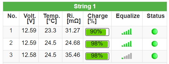 One could assume that these 3 batteries are not full at 12.84 Volt. The new BACS Firmware 2.14 knows better! If you move the mouse over the column "Charge [%]", a blue field appears which shows the currently used measuring method.