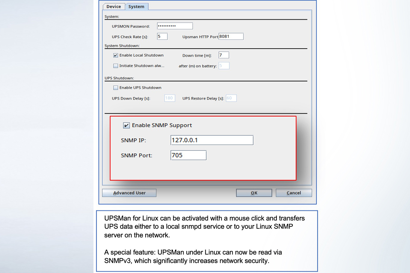 Since security in the dynamic world of server infrastructure has become increasingly important in recent years, also against the backdrop of geopolitical influences, the UPSMan has been upgraded to the best possible extent: The LINUX UPSMAN needs to be more robust against cyber attacks and now comes with a further development - the integration of SNMP V3 – an encrypted SNMP agent - for Linux systems.
