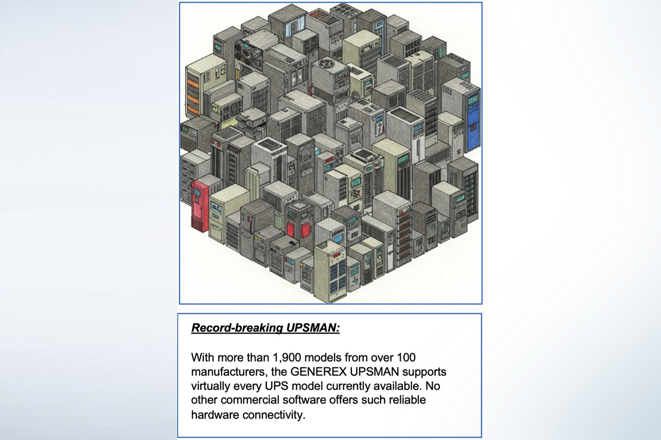 The UPSMan software is one of GENEREX's longest-serving software products. This software tool allows the user to integrate UPS systems serially via USB or RFC1628 over LAN. When combined with RCCMD, it implements a homogeneous and streamlined shutdown solution for client-server systems and displays vital UPS data such as operating status, load, and battery condition in a clear web-based interface.