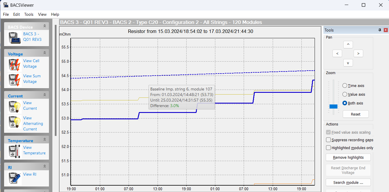 Da BACS auf jeder Batterie ohnehin installiert wird, könnte diese material- und personalintensive zusätzliche Messung eigentlich entfallen. Alles, was BACS benötigt sind Entladungen, die entweder „von selbst“ auftreten (wegen Stromausfall) oder „manuell“ durch den Batterietechniker ausgelöst werden. Analysetools wie der BACS VIEWER erlauben eine schnelle und direkte Auswertung der aufgezeichneten Daten der Entladung und liefern direkt den SOC und SOH als Ergebnis und den direkten Vergleich mit den Daten einer früheren Entladung und damit um wieviel % die Laufzeit der Akkus in angegebener Zeitspanne abgenommen hat.