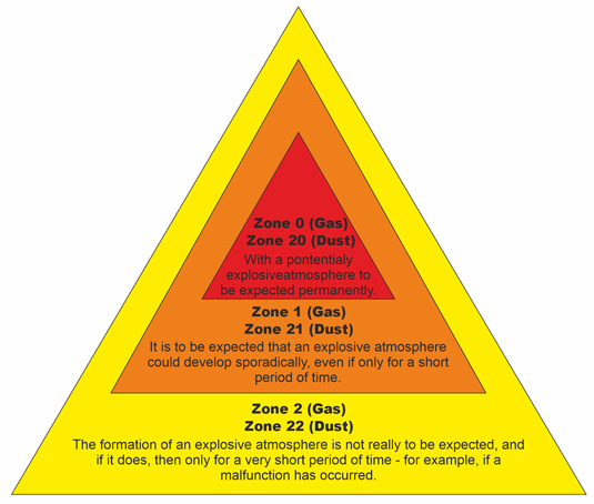 Unter diese Zonendefinition fallen Standorte, an denen eine explosionsfähige Atmosphäre bestehend aus einem Gemisch aus Luft oder gefährlichen Stoffen in Form von Gas, Dampf oder Nebel entstehen kann ... Typische Beispiele sind Treibstofftanks und Betankungsstutzen, Förderplattformen von Gas und Öl, aber auch Klärwerke können im Betrieb brennbare Gase ausbilden.