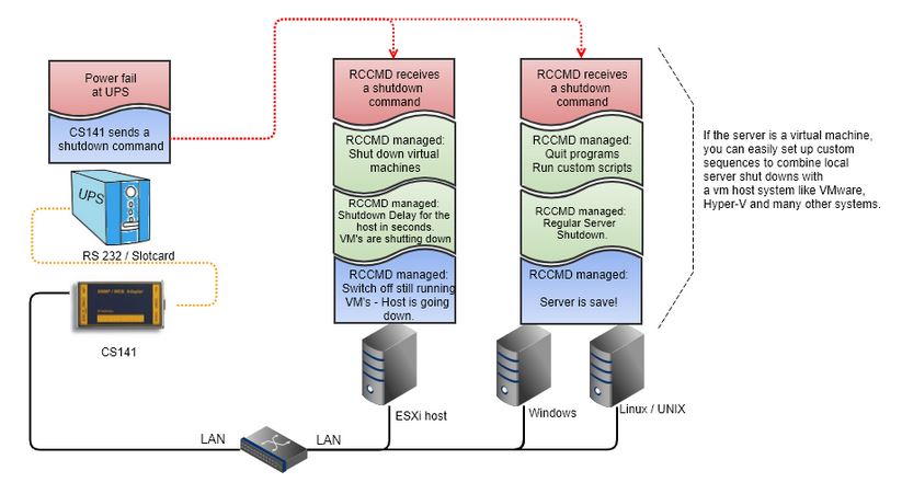 RCCMD is also integrated into the network cards of many other well-known manufacturers of UPS devices, sensor manufacturers or manufacturers of other systems. These licensees have integrated RCCMD into their own monitoring devices and, in the event of an alarm, send a shutdown into the network that is RCCMD compatible - every RCCMD client that receives this signal will then start its own shutdown procedure, just as if the RCCMD transmitter were from a GENEREX network device been sent out.