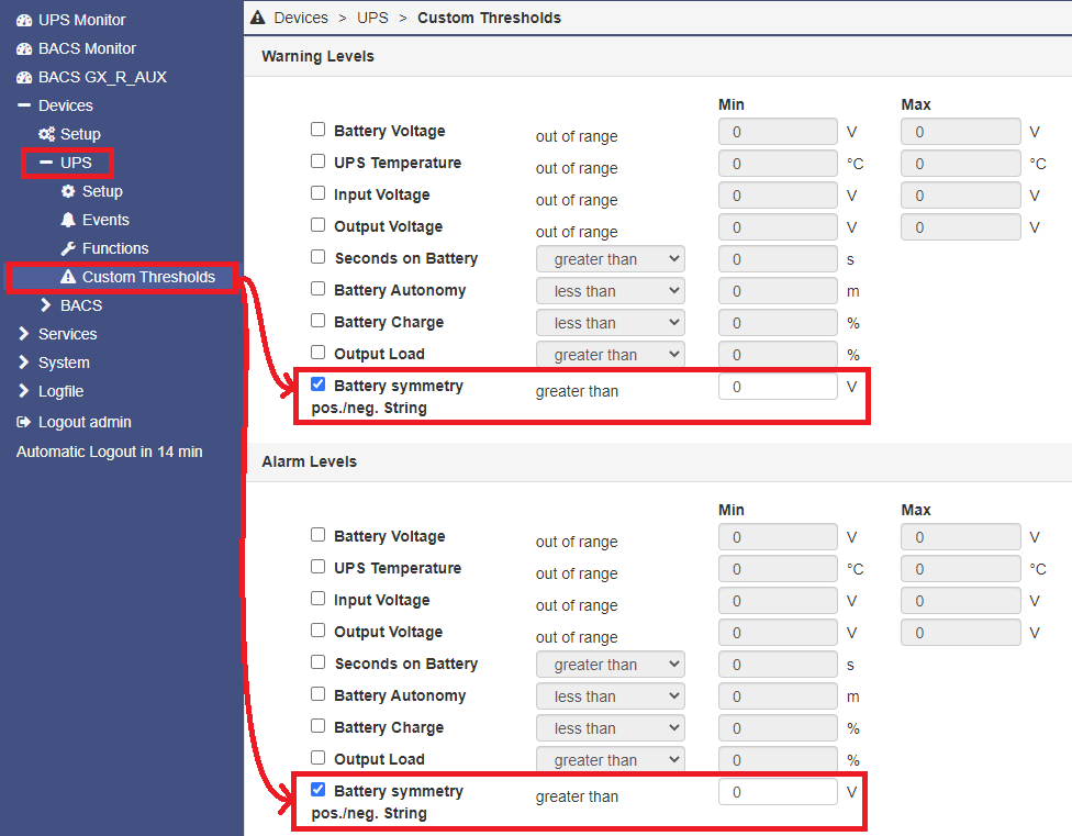 Available on all CS141 for UPS where we read the measured values for the battery voltage for a center tap, we now offer a new configurable limit: "Battery Symmetry". This allows the configuration of a "symmetry monitoring" which outputs a warning when the batteries, for example, differ in the two strings by more than 3 volts. It can now be issued a warning and trigger the 2nd limit as an alarm escalation. Below is the configuration of the symmetry monitoring CS141 / BACS.
